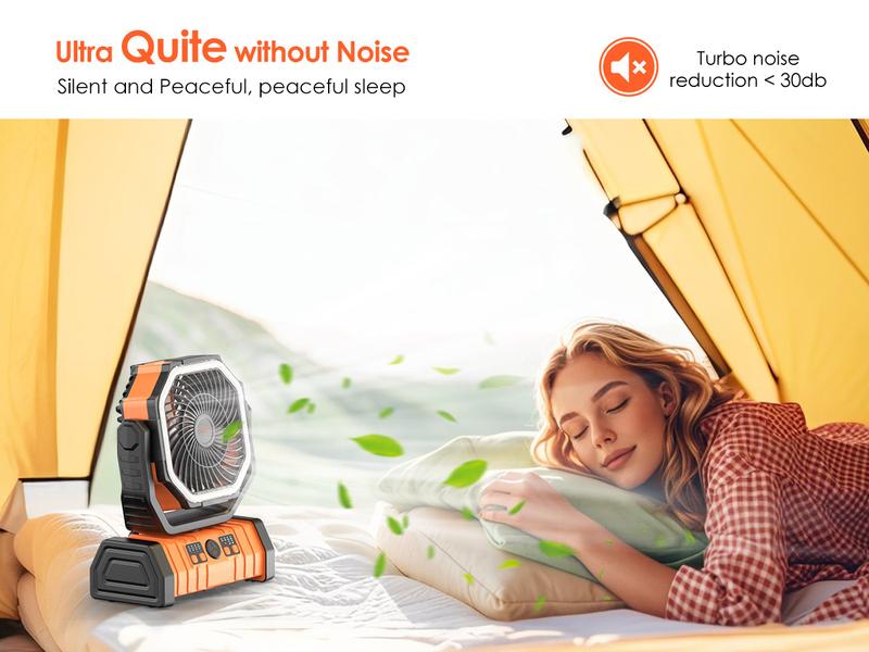 - 270° manual tilt + 360° hanging hook for flexible placement (tent, RV, patio, or bedside)