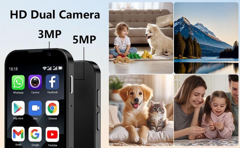 【3MP + 5MP Dual Camera Setup】-The MINI smartphone is equipped with a 3MP front camera and a 5MP rear camera, enabling you to capture nice photos despite its compact size.